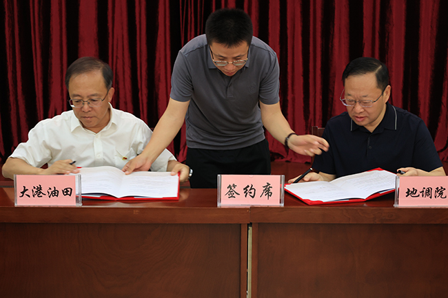 儀式上,在雙方與會人員的共同見證下,地調(diào)院有限公司董事長李愛民和大港油田公司經(jīng)理孫澤新,代表雙方現(xiàn)場簽訂合作協(xié)議。